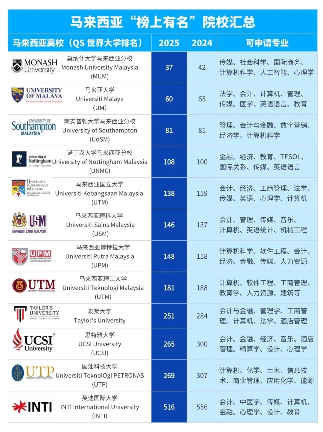 一ơ刷升学论坛Ӟ他偶?dng)看到沉?85大学国际本科目标招生消息,沟通事后,家正在南岸区的他Q周末特地坐轻轨M位于沙坪坝的校区。测试那天,据他后来跟家Q数学题大多是根本题型,p面试聊到沉庆的炎天,他还跟教员分享了自家降温的小妙招Q氛围很L。一周后收到马来西亚目班offerӞ廖杰的妈妈正忙着l他打听补录消息Q看到通知书的霎时Q频频确认了好几遍:(x)“U的校园里上课?”成就不抱负的学生和家长不妨看看,沉庆985国际本科Q大概就是阿谁v艌Ӏ?img src="/uploads/allimg/250812/11161R500-0.png" width="600" />1。留学优胜:(x)马来西亚l济发胦(ch)Q不变,p口成本低,很是适合工薪阶家庭的学生。其多元文化布景Q马来、华人、印度文化交融)(j)创制了一个包涵且富有zd的社?x)??p讲授Q做联邦国度Q马来西亚的U立大学和部门公立大学采用全英文讲课Q学生能正在沉浸式英语中敏捷提拔a语能力??多元文化体验Q马来西亚是多元文化交汇之地Q华人、马来h、印度h协调共处Q留学生可体验春节、开斋节、屠妖节{分歧文化的庆典Q品叻沙、椰饭{特色美食??高性h(hun)比留学:(x)比拟Ƨ美国度Q马来西亚的留膏火用仅ؓ(f)1/4?/3。公立大学本U年膏火U?500-25000元hqxq币Q私立大??-4万元人^易近币,p口Ҏ(gu)月约2000-3000元hqxq币?img src="http://q8.itc.cn/q_70/images01/20250709/23cc07bbbe1c47ddafdeba177e8ab385.jpeg" width="600" />6?甌便利Q签证成功率高:(x)马来西亚留学能够先不需要雅?托福成就Q可先读a语班Q,无需l济Q签证成功率接近100%Q申hE简单快速??旅逛胜地取宜居天气Q马来西亚具有兰卡威、热岛、双子塔、马六甲古城{出名景点,全年温暖Q?8°C-30°CQ,适合p口和进修??中马敌对关系Q马来西亚是中国正在东盟的最大商业伙_(d)两国关系慎密Q留学生l业后正在当地或回国׃均有q漠机遇?img src="http://q9.itc.cn/images01/20250403/d919e7eaa2f14290a777fa12615b7f.png" width="600" />雉槛:(x)无需高?“l验?rdquo;Q蟩q雅思托?“BOSS ?rdquo;Q间接传送至马来西亚?200 名校副本入口Q神U配备库Q开局l定 985 高校 “办事?rdquo;Q共享名校师资、学术资本,相当于自?“l验加成 Buff”Q高性h(hun)比@金方案:(x)取通俗qxq办本科同?“金币耗损”Q却能获?“全球认证皮肤”Q世界名校文凭)(j)Q性h(hun)比间接拉满!l极技术树(wi)Q国际化评 + 个性化培育Ҏ(gu)Q帮你解锁性思维、跨文化交换{?“技?rdquo;Q无论是 “职场疆场” 仍是 “深制副本”Q都能轻杄压!马来亚大学Universityof Malaya1905q徏校,公立研究型分析大学,位于马来西亚首都吉隆坡。环承^z大盟,亚洲大盟Q东盟大盟,全球产学来人才培育{略联盟Q以文理学科和医学著U正在很多学U范畴n有世界的声誉,多个学科范畴q入世界?00名,此中17个学U范畴进入世界前100名。正?025q高档教育研I机构QS发布排名中,马来亚大学位列全球第60位。马来西亚国立大学TheNationalUniversity of Malaysia1970q徏校,马来西亚五所公立研究型大学之一Q?011q_(d)学校正式核准中文名字为马来西亚国立大学;东盟大盟Q英联邦大学协会(x)Q亚z取承^z大学协?x);共?3个学院是一所分析型大学,专业普遍Q有文、理、工、商、医U等各类专业Q被泰晤士报教育专刊列ؓ(f)世界U技cd?00强。正?025q高教育研I机构QS发布排名中,马来西亚国立大学位列全球W?38位。马来西亚理U大学UniversityofScience Malaysia1969q徏校,公立研究型分析大学;素有“亚洲的花圃大学的佌Q具有三个校区,?8个学院及(qing)26个研I核心,500多个专业范畴的硕士和博士学位评Q东盟大盟。马来西亚教育部选中成ؓ(f)APEX(q向杰出打算)大学Q经学、艺术学、理学、工学医学ؓ(f)马来西亚国度沉点学科。正?025q高档教育研I机构QS发布排名中,马来西亚理科大学位列全球W?46位。马来西亚博Ҏ(gu)大学Universiti Putra Malaysia1931q徏校,东南亚出名分析性研I型大学Q?1%的教师具有博士学位;d学、农业和林业专业位居马来西亚W一Q经取办理学院和商学院同时荣获AACSB商学院认证,是马来西亚第一个世界l管院取商学院;文学、英语、科学、教肌Ӏ计较机U学取消息、会(x)计取金融、工商办理、经学取计量经学、电(sh)子工E、机械工E和化学工程范畴Q位居世界学术排行榜200强;2025q高教育研I机构QS发布排名中,马来西亚博特拉大学位列全球第148位。马来西亚理工大学University of Technology Malaysia1984q徏校,公立研究型大学,从校Z于柔?jng)州新山市(jng),分校正在吉隆坡?jng)核心(研究生院)Q有12个学院和20多个研究所和核心;学校全英讲课Q利于英语能力的提高Q同时学生可选择专业面广Q以办理和手艺类专业见长Q专业劣势出众,׃前景好?025q高档教育研I机构QS发布排名中,马来西亚理工大学位列全球W?81位。伍伦A(ch)大学马来西亚校区University of Wollongong Malaysia始徏?951q_(d)正在全球有四个分校!本部、_拜分校、马来西亚分校以?qing)分校。从校区位于新南威尔士州伍u贡市(jng)Q是大学全球合做联盟、亚太地域大盟、也是颠末AACSB商学院N易认证的高学府。该校其消息手艺、计较机U学、工E学范畴代表全澳尖E度Q计较机学院是最大的ICTU研核心Q南半球最大的消息手艺取电(sh)信研I机构之一?025q高教育研I机构QS发布排名中,伍u贡大学位列全球第167位?img src="http://q7.itc.cn/q_70/images01/20250707/d4bc664938bf4f2891410388aca1f983.jpeg" width="600" />?x)计取金融?x)博特拉大学(AACSB认证Q、泰莱大学(工商办理世界W?7Q聚焦胦(ch)攉K发取贸易实践能力培育。酒店办理:(x)泰莱大学Q世界第16Q、思特雅大学(世界?00Q依托行业资本,强化实