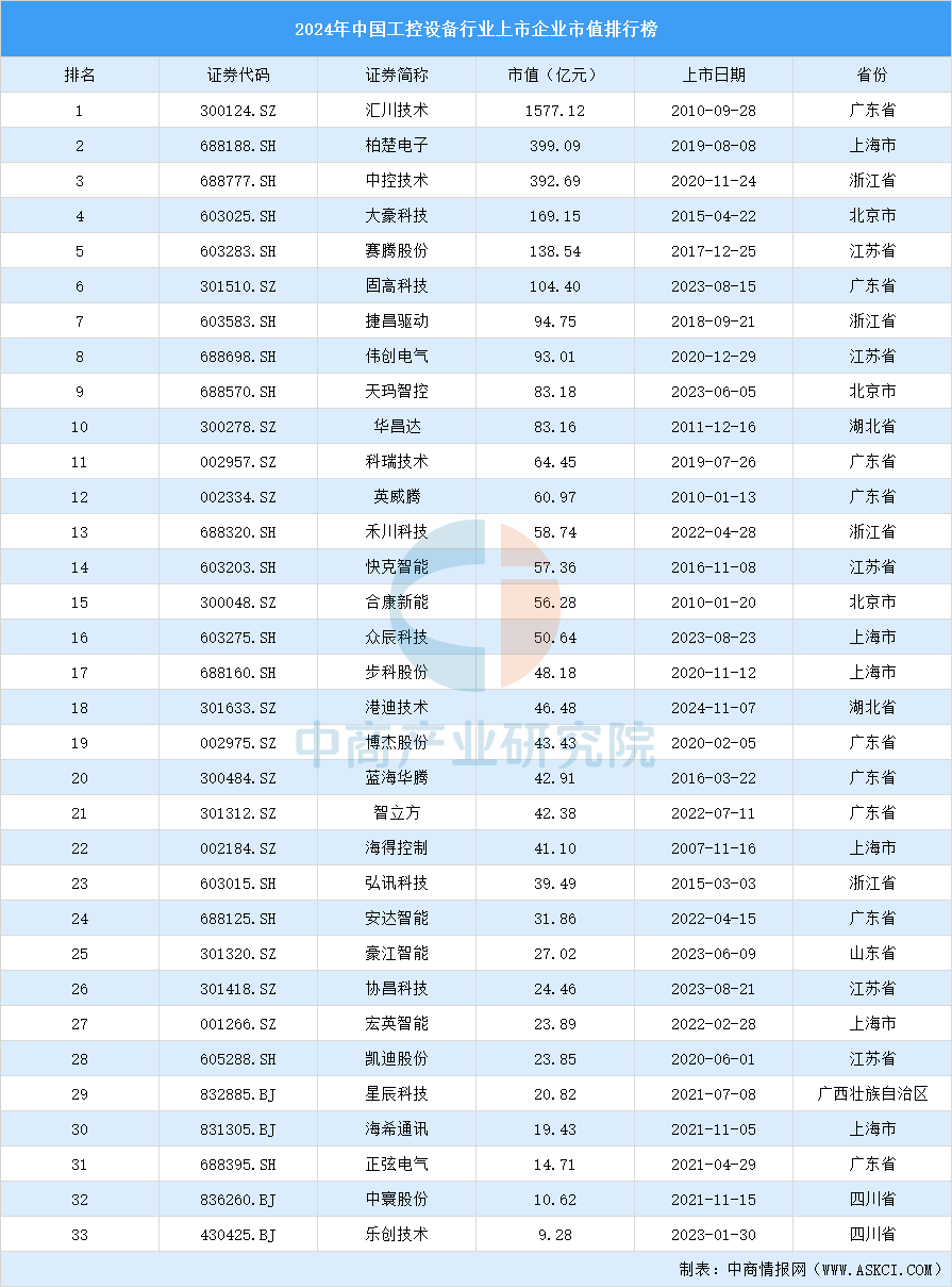 中商谍报|讯Q中商胦(ch)产研I数据库显C,2024q中国工控设备行业市(jng)值最大的十名上市(jng)企业别离是汇川手艺、柏楚电(sh)子、中控手艺、赛腾股份、固高科技、伟创电(sh)气、天玛智控和华昌达?/p>