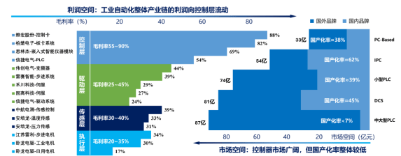 全体而言Q工业从动化节制层物正在工控系l中承担“大脑”的脚Ԍ需要及时、施行层{承?ldquo;四肢”脚色的设备,正在一个功能完整的工控pȝ中节制层产物的数量较?yu)但h主要的功能,因而全体而言工业从动化胦产链中的利润I间向节制层产物集中。以行业内代表性上市公ؓ例,施行层设备的毛利率程度集中正?0%?5%Q传感层讑֤的毛利率E度集中正在30%?0%Q驱动层讑֤的毛利率E度集中正在25%?5%?/p>